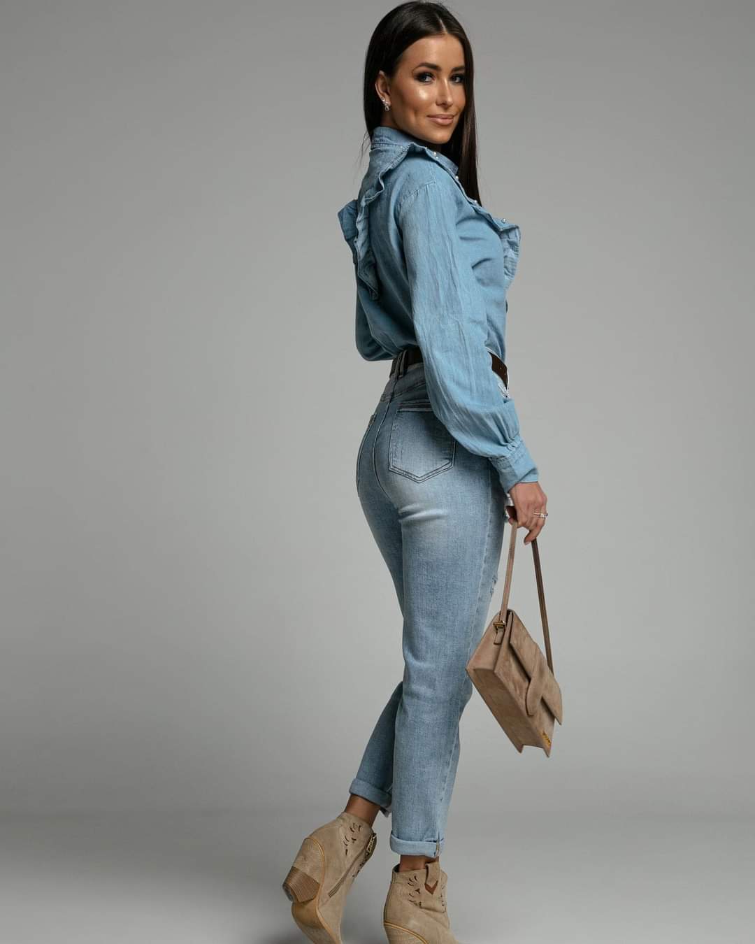 Beautiful denim shirt embellished with pearls and rhinestones.