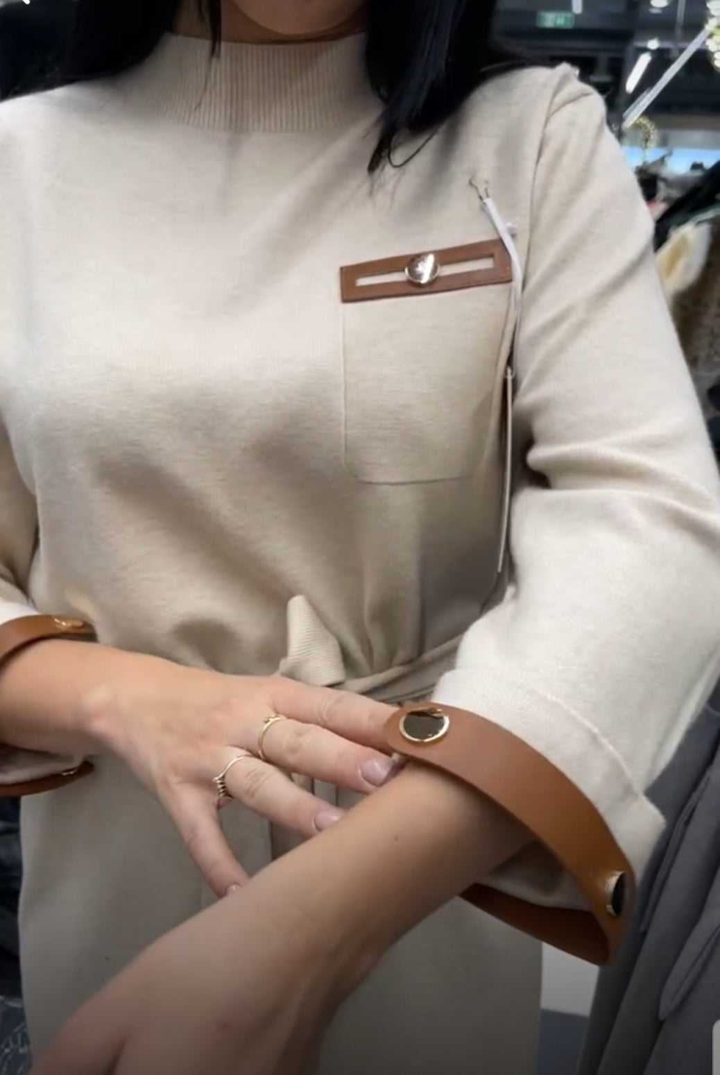 Beautiful premium quality midi cream knitted dress with belt and faux leather elements. Perfect for cooler days.