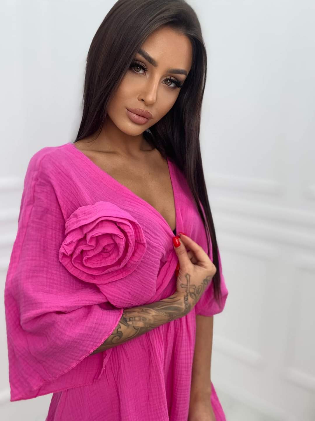 Gorgeous short fuchsia dress with 3D rose, v neck. Perfect for summer, party or every day. You can style it with flip-flops, sandals, heels or trainers.