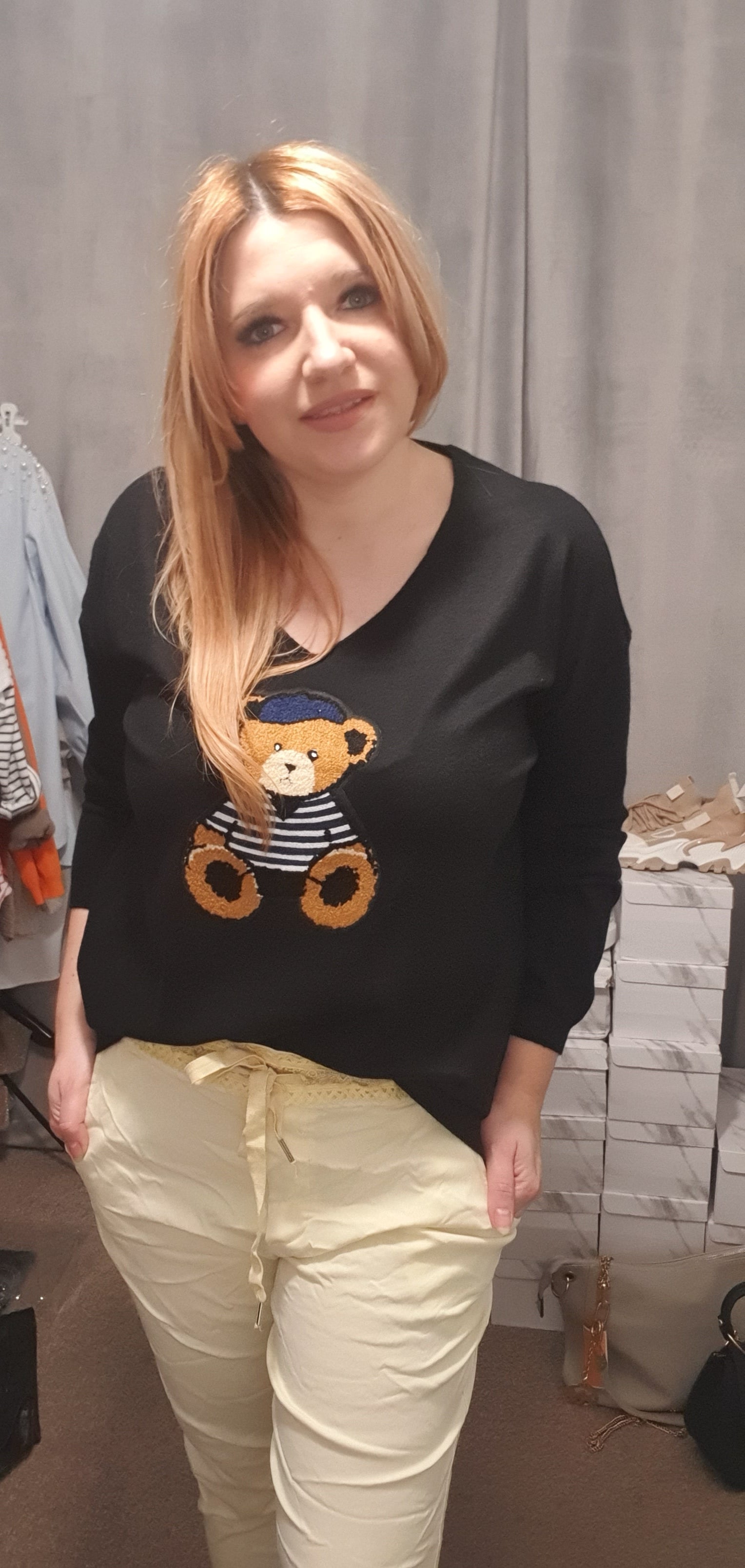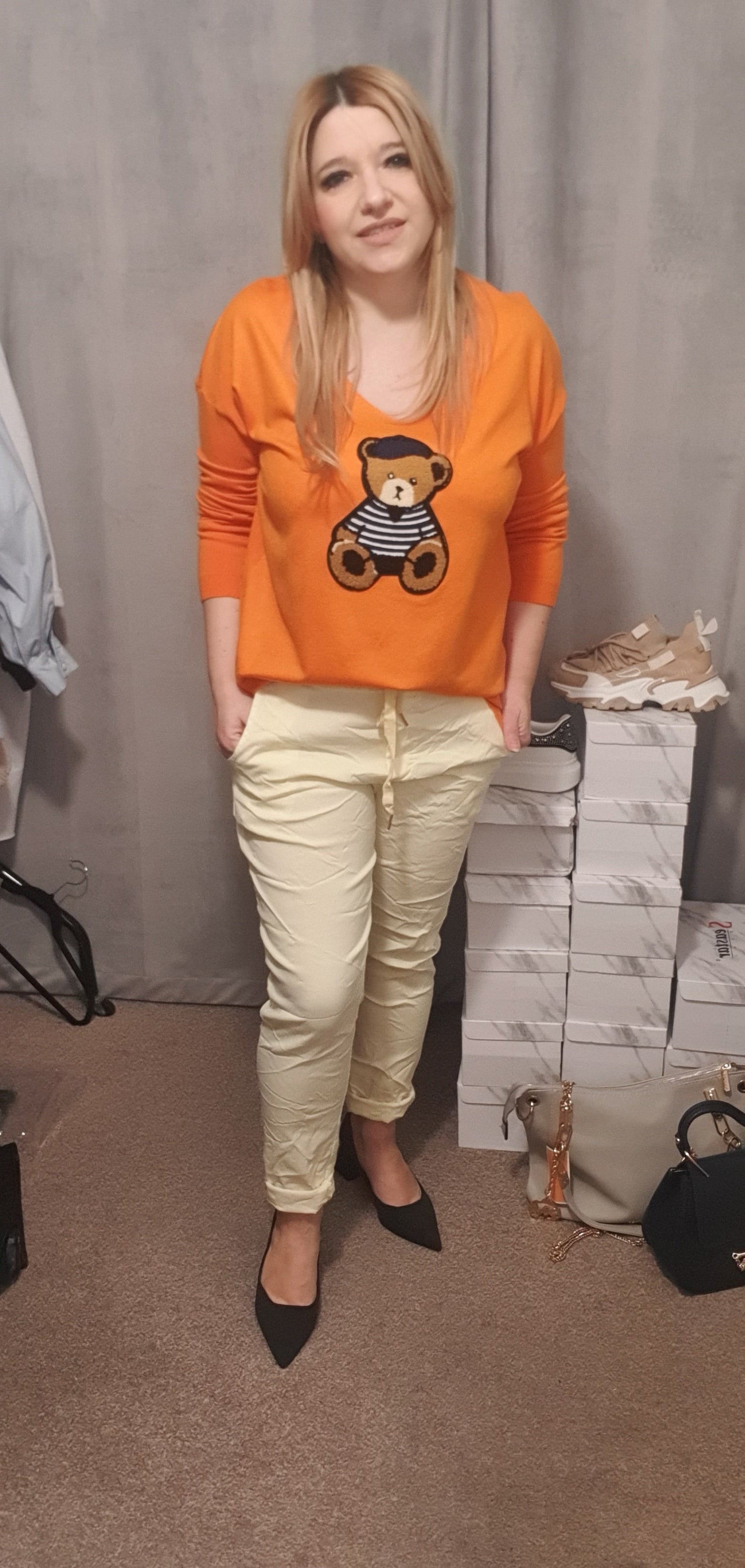 Very comfy jumper, with a beautiful teddy application. Available in black and orange colour.
