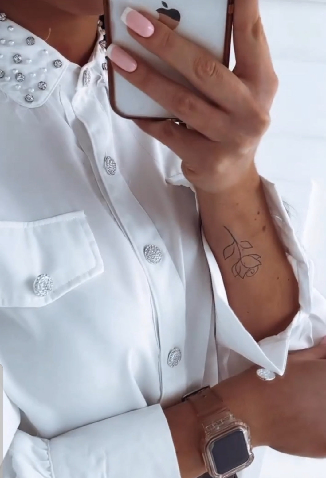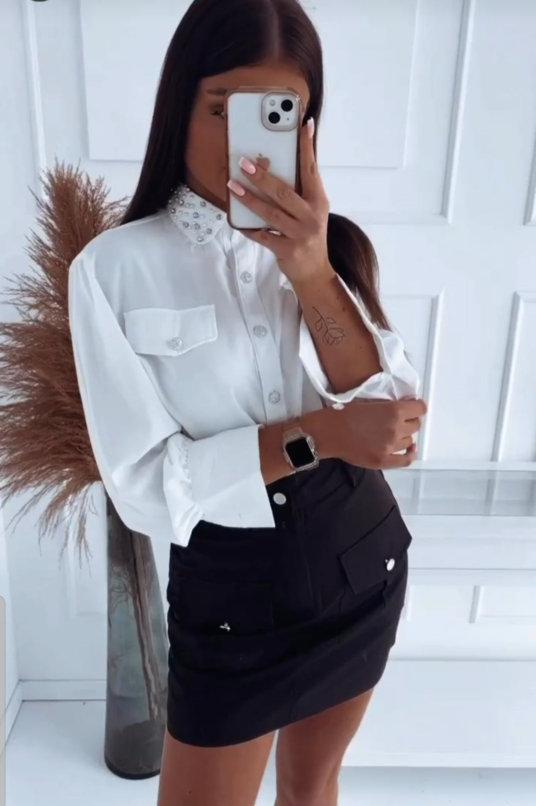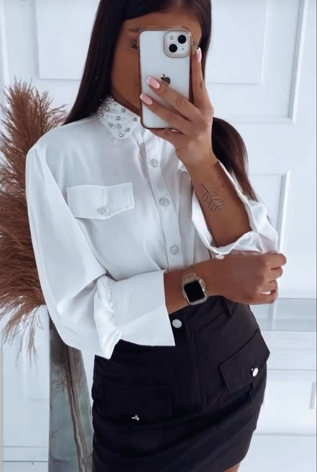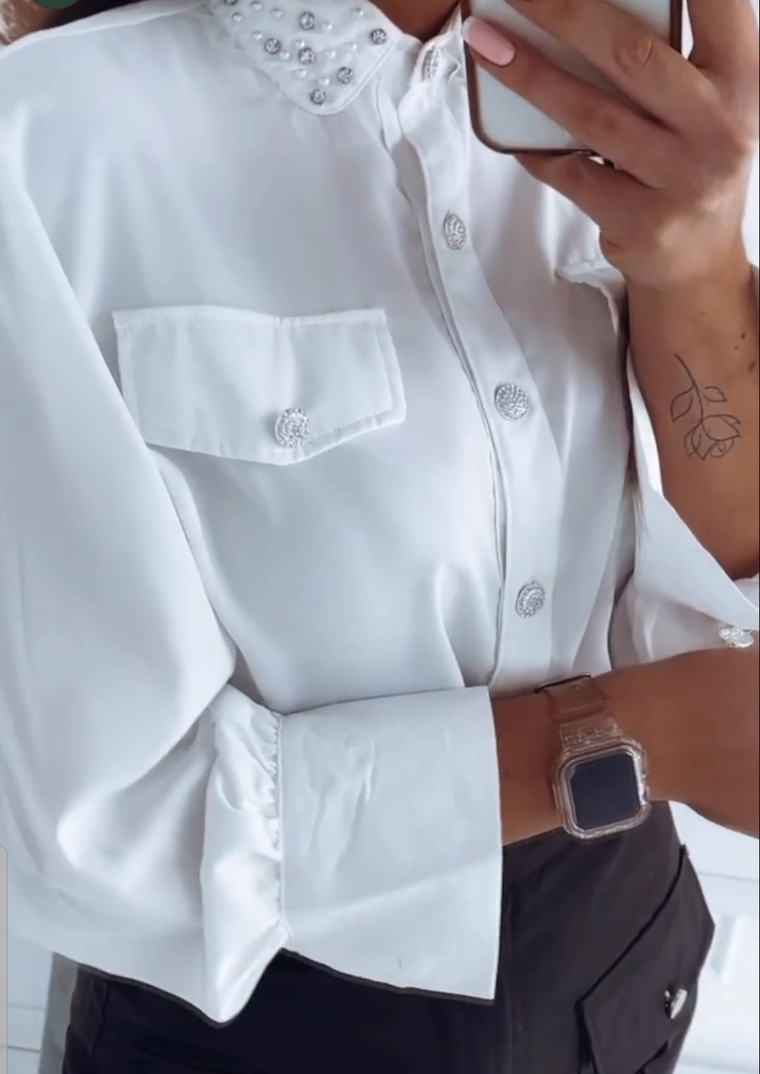 Gorgeous off-white shirt, blouse with decorative buttons and collar. Dressy, perfect for a more formal, office outfit.