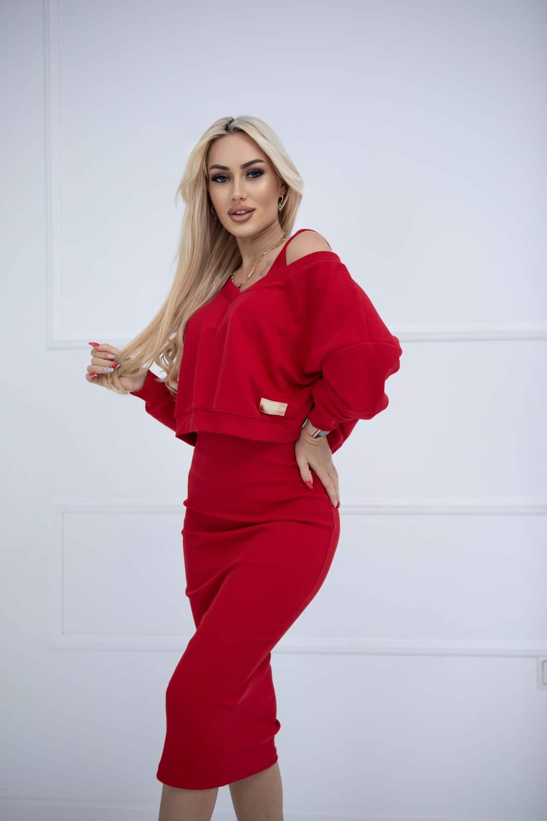 Red Two Piece Coord Set Midi Bodycon Dress And Sweatshirt One size